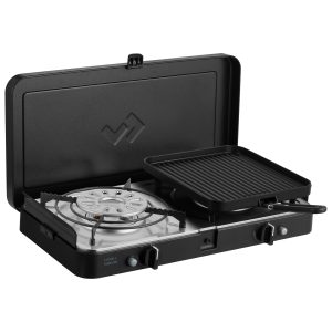 Zakres dostawy: podstawka pod patelnię, gładki ruszt do grilla, żebrowany ruszt do grilla, osłony przed wiatrem, zdejmowany uchwyt i torba do przenoszenia/przechowywania.