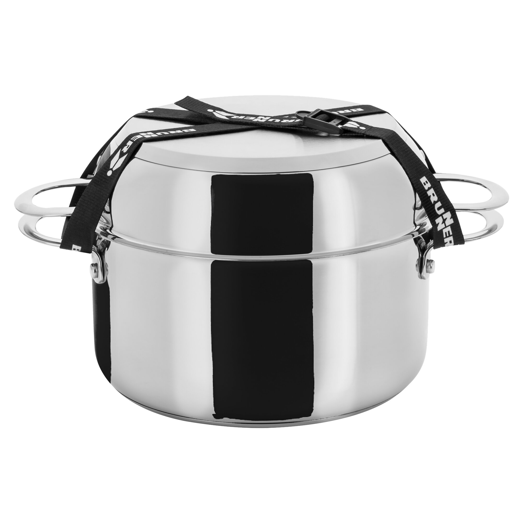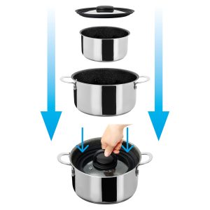 Wysokiej jakości kolekcja garnków ze stali nierdzewnej z powłoką zapobiegającą przywieraniu. Oszczędność miejsca. Szczególnie polecane do pojazdów rekreacyjnych i łodzi. Duży garnek i patelnia wyposażone są w solidne uchwyty i dno termiczne. Nadają się do kuchenek gazowych, elektrycznych, ceramicznych i indukcyjnych. Można myć w zmywarce. Z systemem Vacublock.