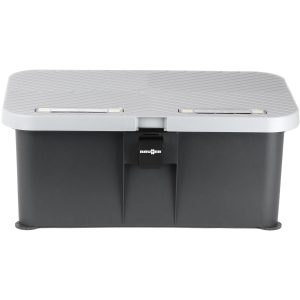 Stopień wejściowy do przyczepy kempingowej z wewnętrznym schowkiem na buty, akcesoria, narzędzia itp. Zamykana, wodoodporna pokrywa jest wyposażona w antypoślizgowy stopień i zintegrowane oświetlenie solarne. Bardzo solidna konstrukcja z wysokiej jakości tworzywa sztucznego z regulowanymi nóżkami do poziomowania.
