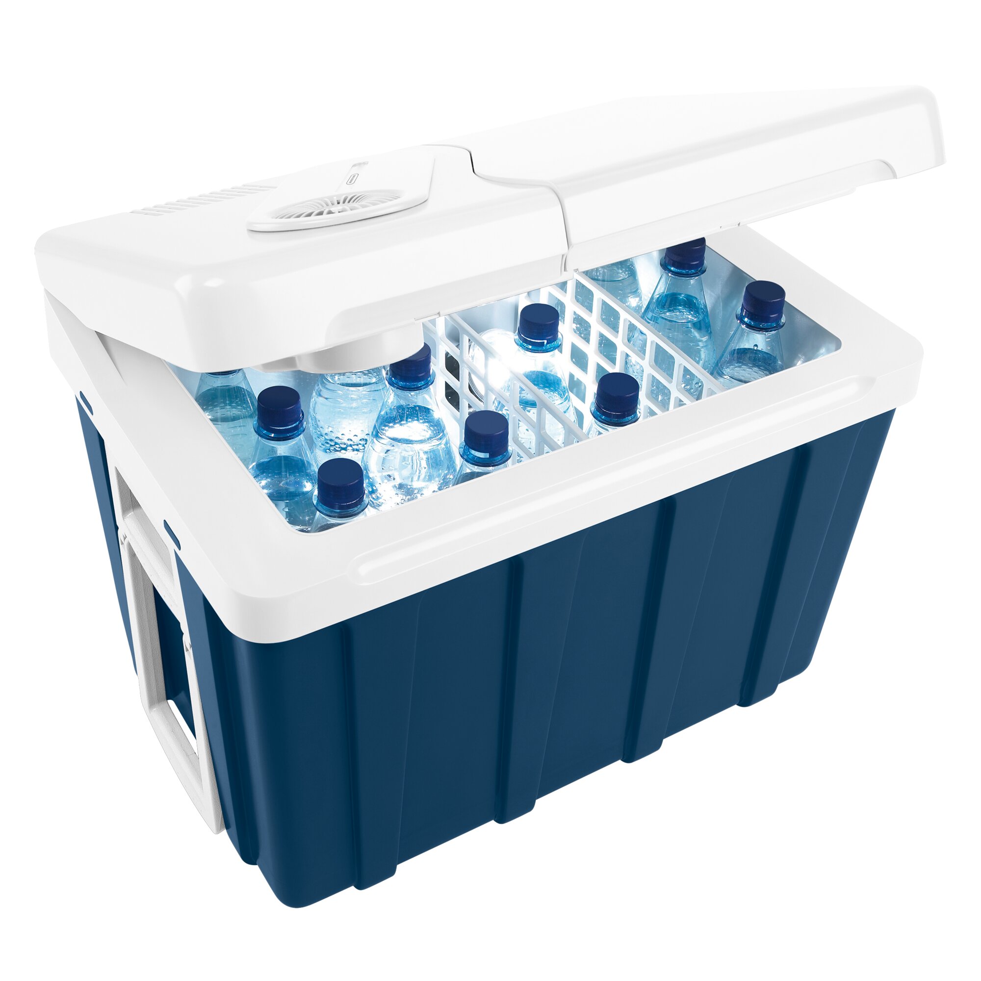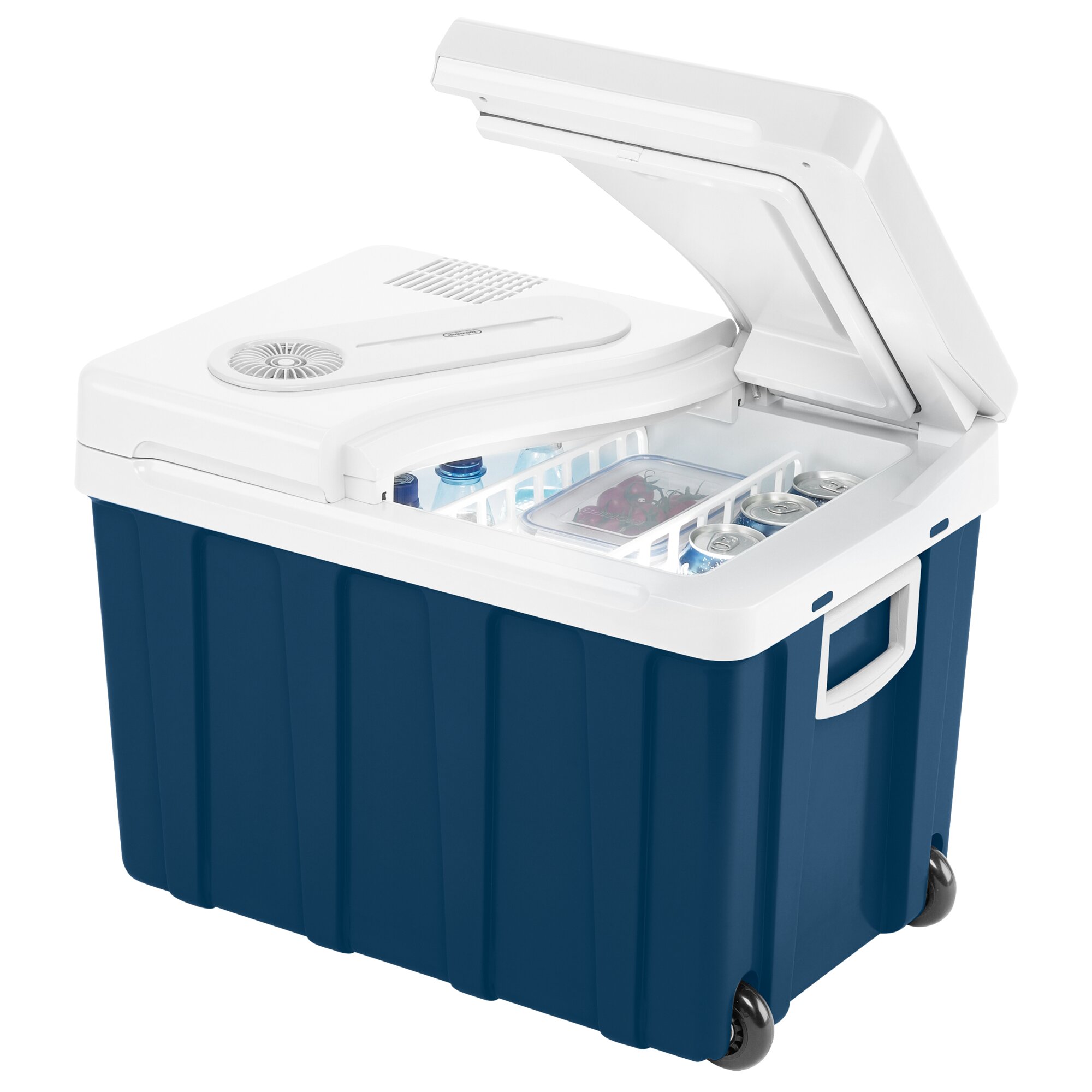 Ta lodówka oferuje wszystko, czego potrzebujesz: 2 strefy napięcia do użytku w pojazdach i sieć 230 V, 2 poręczne kółka i wysuwany uchwyt do transportu, schowek na kable, oddzielną pokrywę oraz 2 wyjmowane przegrody zapewniające odpowiednie oddzielenie przestrzeni wewnętrznej o łącznej pojemności 39 l, co zapewnia wystarczającą wysokość do przechowywania pionowo stojących butelek o pojemności 2 l.