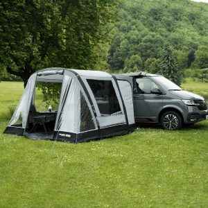 Nadmuchiwana markiza Hydra do vanów i kamperów oferuje optymalne wykorzystanie przestrzeni dzięki zmodyfikowanemu kształtowi przedniej rury powietrznej. Pozwala w pełni wykorzystać powierzchnię podłogi i zapewnia przestrzeń nad głową na całej powierzchni dachu. Zdejmowany łącznik (nie wchodzi w skład zestawu) ułatwia rozkładanie i składanie namiotu. Kolejną zaletą jest niewielki ciężar, który trzeba wciągnąć do markizy. Dzięki systemowi rur powietrznych komory powietrzne napełniają się w krótkim czasie. Dołączona podłoga oferuje maksymalną elastyczność i można ją przymocować do markizy za pomocą rzepów. Za pomocą opcjonalnego zestawu Drive-Away-Kit (610/262) namiot staje się wolnostojący i można go zostawić na kempingu.