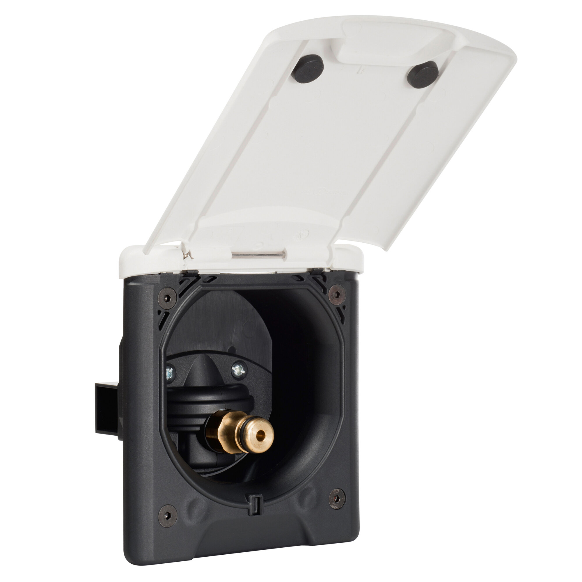 Przyłącze wody miejskiej, tworzywo termoplastyczne. Czysta biel (RAL 9010), czerń lub antracyt. Z reduktorem ciśnienia i magnetyczną pokrywą na zawiasach, ciśnienie wody jest redukowane do 1,1 bara. Wymiary otworu: 85,5 x 90 mm.
