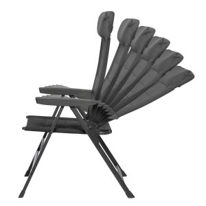 Składane krzesło ogrodowe z 4 nogami i 6-stopniową regulacją oparcia. Aluminiowa rama; materiał pokrycia: wyściełana siatka 3D. Wytrzymałe plastikowe podłokietniki. Możliwość dołączenia podnóżka. Kompaktowe i łatwe w transporcie po złożeniu.
