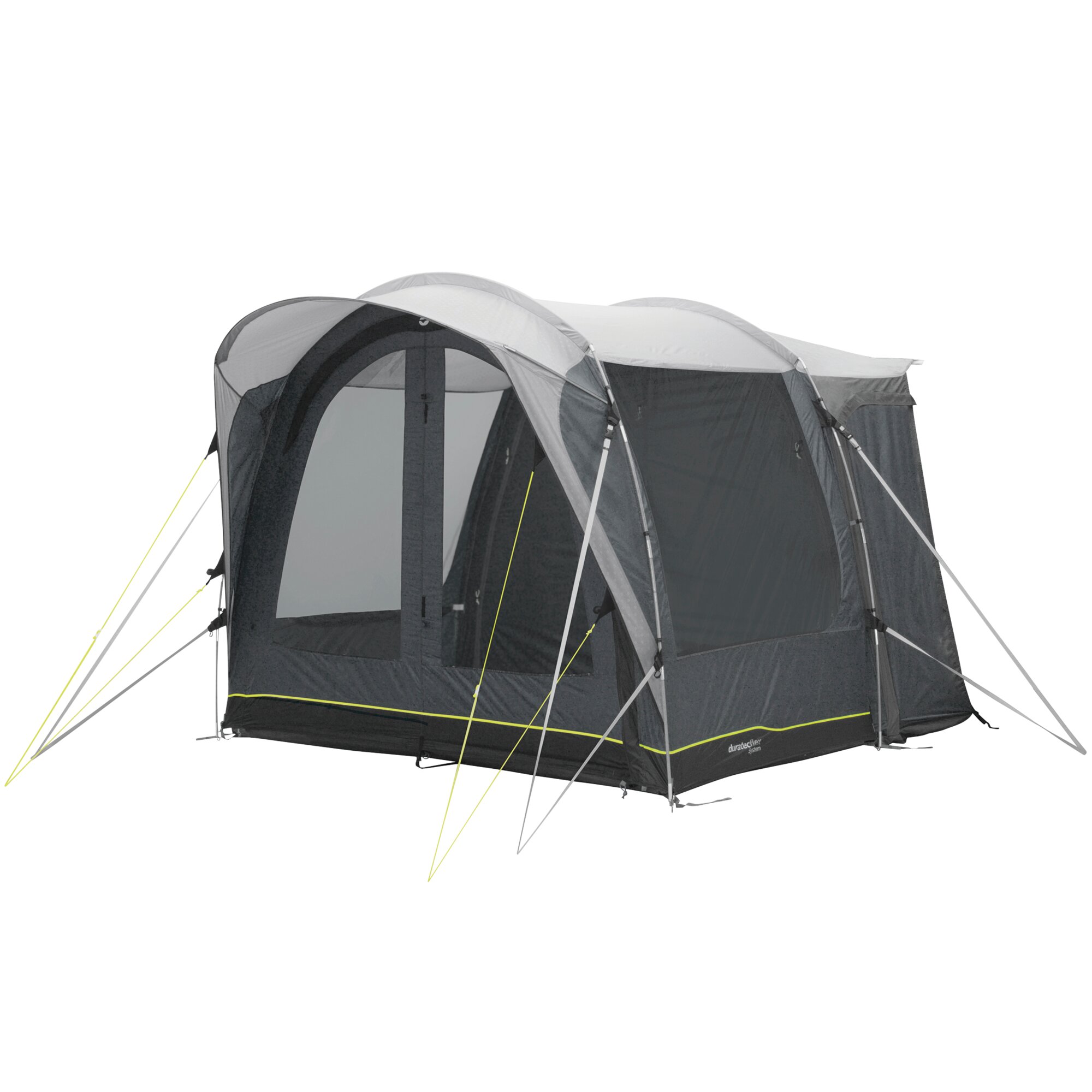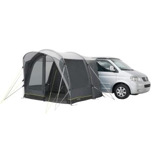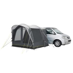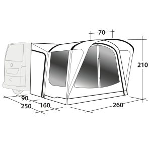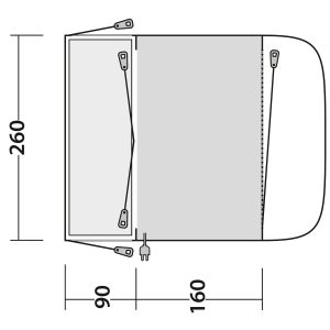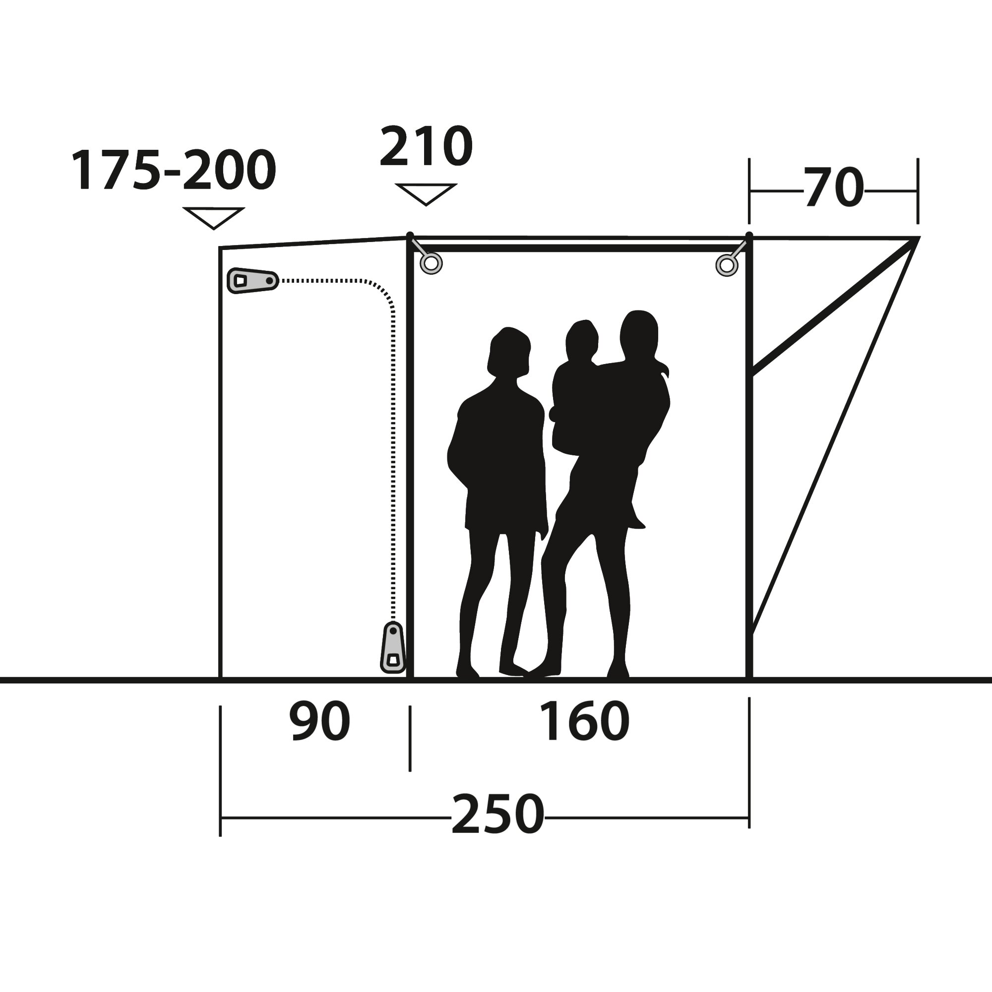 Ściana przednia: pionowa dla optymalnej przestrzeni mieszkalnej. Możliwość całkowitego otwarcia za pomocą podwójnego zamka błyskawicznego. Płaskie, składane drzwi przednie z moskitierą. Duży daszek zapewnia ochronę przed deszczem i słońcem.