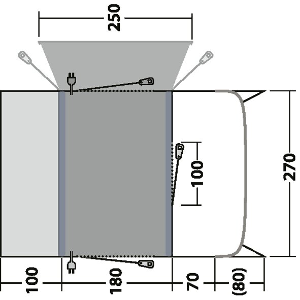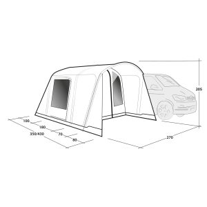Ściana przednia: pionowa z daszkiem (dużo miejsca nad głową i wewnątrz dzięki wstępnie uformowanym dętkom). Możliwość całkowitego otwarcia za pomocą podwójnych zamków błyskawicznych. Z drzwiami i kompletnym panelem z siatki zapewniającym wentylację bez owadów.