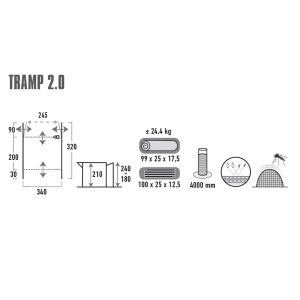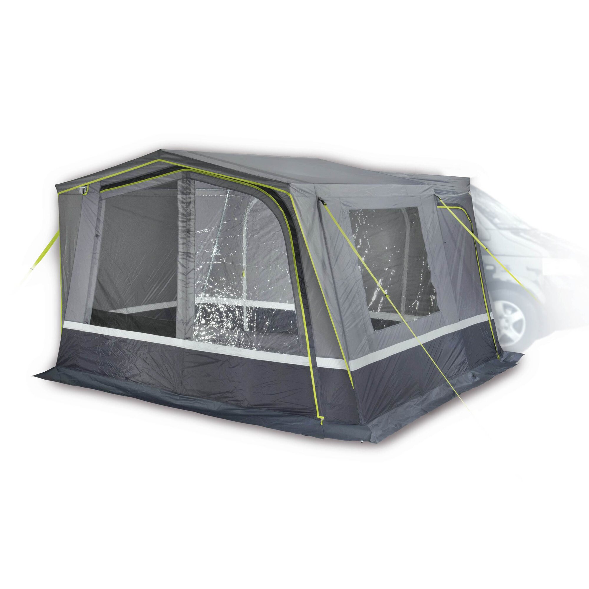 Klasyczna, wolnostojąca markiza do furgonetki jest bardzo stabilna i oferuje optymalne wykorzystanie przestrzeni. Zdejmowana podłoga i fartuch przeciwbłotny z PVC chronią przed brudem i wilgocią. Wyposażona w wytrzymałe, kryte zamki błyskawiczne, szynę z suwakiem oraz cztery neonowożółte pasy sztormowe i linki odciągowe. Łącznik zwijany ma długość mocowania do dachu 245 cm. Drążek łączący z zaciskami lub linkami odciągowymi. Podwójna rura Drive Away 5,8/7,2 mm z zamkiem błyskawicznym. Trzy szlufki na rzep do relingu dachowego. Dzięki bardzo szerokim, zdejmowanym pasom napinającym "Quick Fix" markizę można szybko przymocować do pojazdu. Nie nadaje się do podnoszenia dachów.