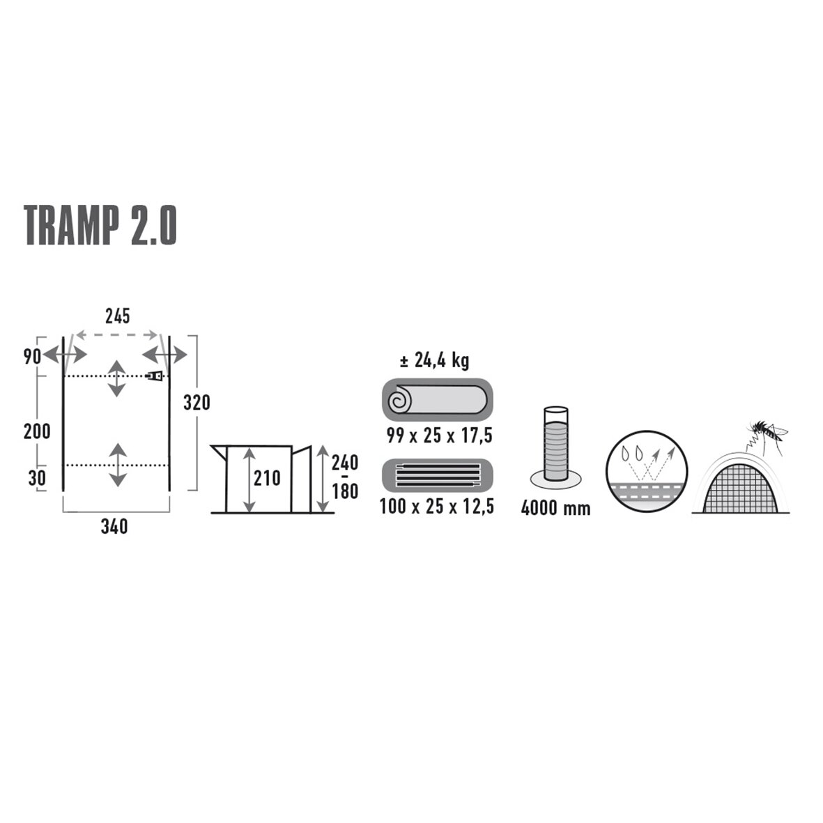 Materiał: poliester 150D z powłoką PU i uszczelnionymi szwami; podłoga: 100% polietylen PE.