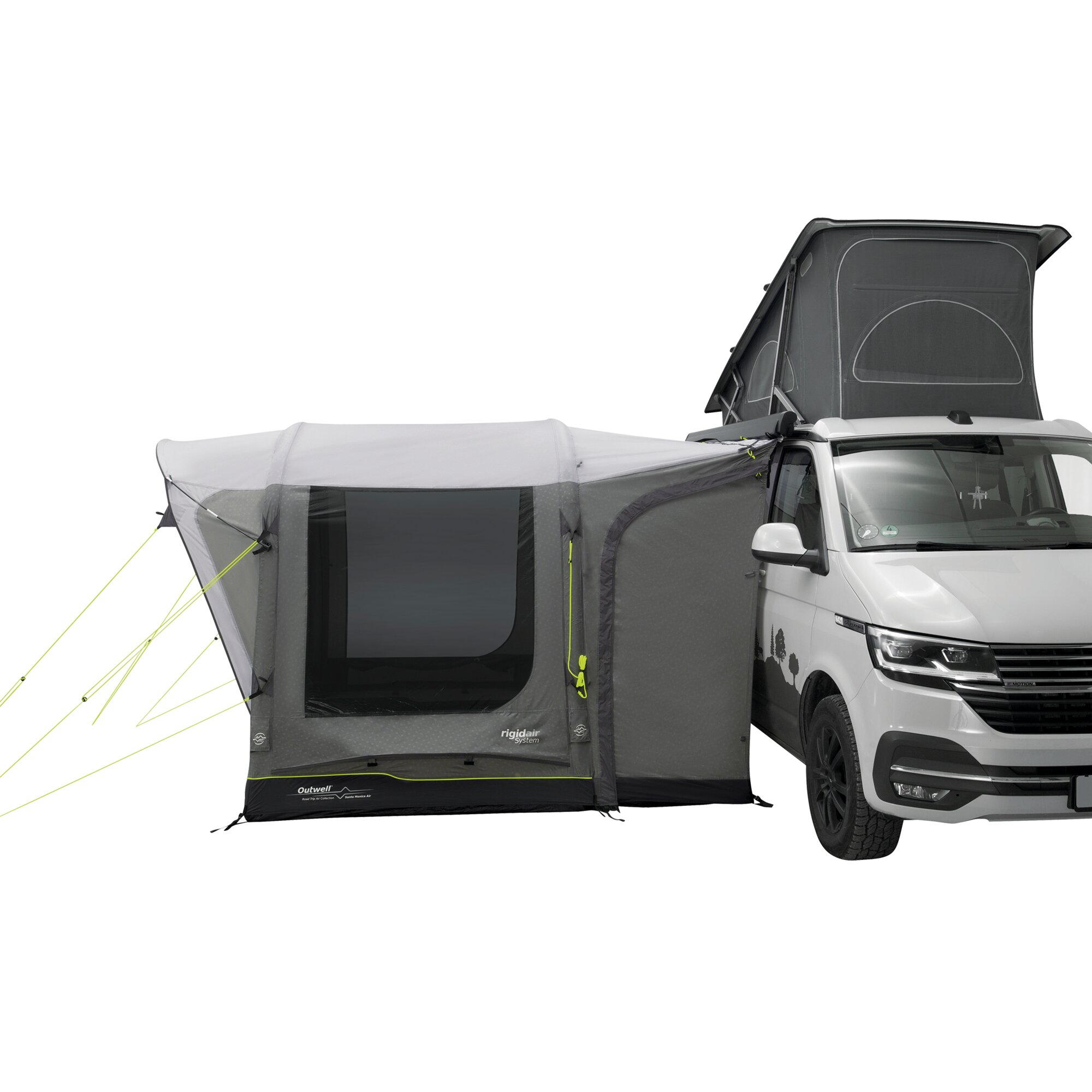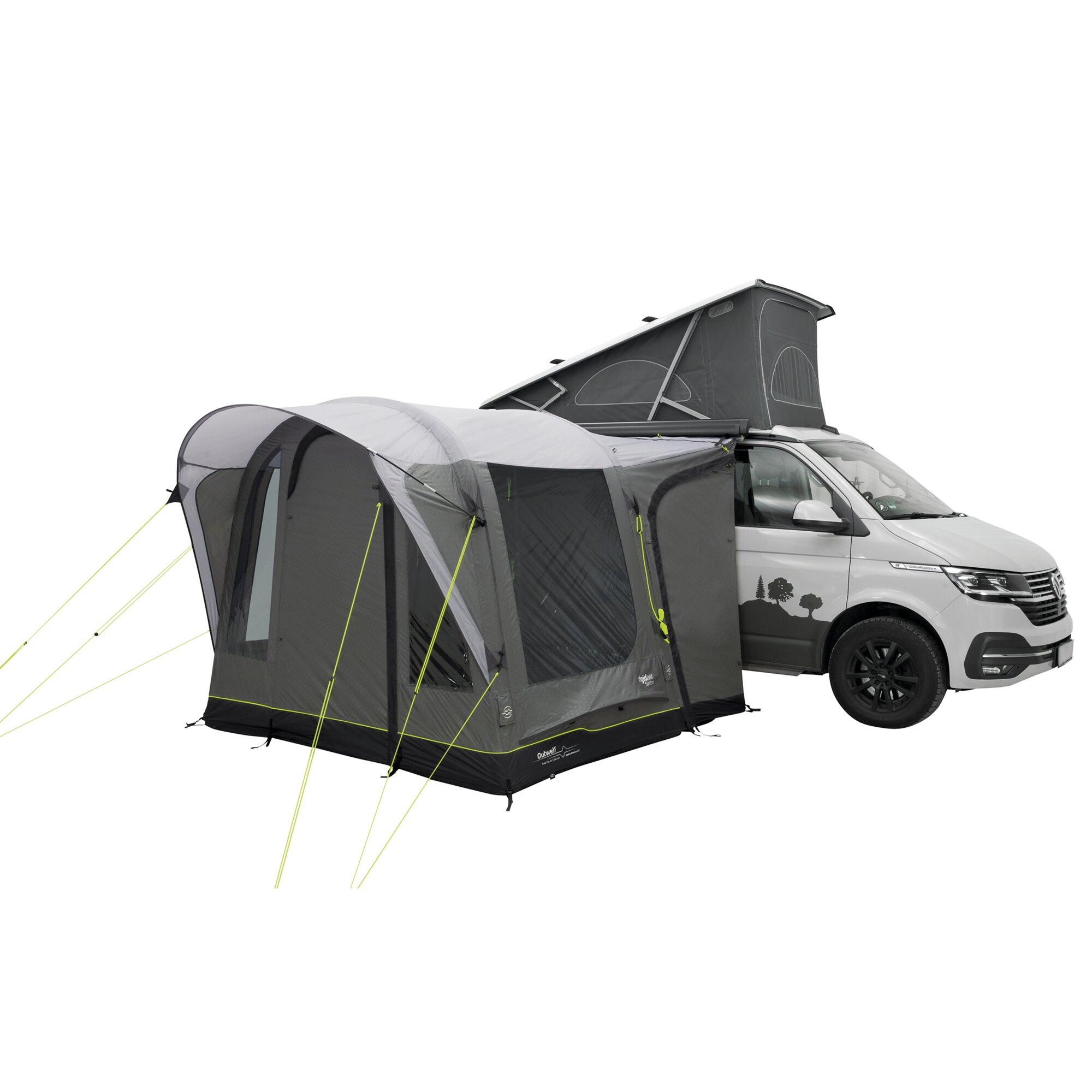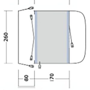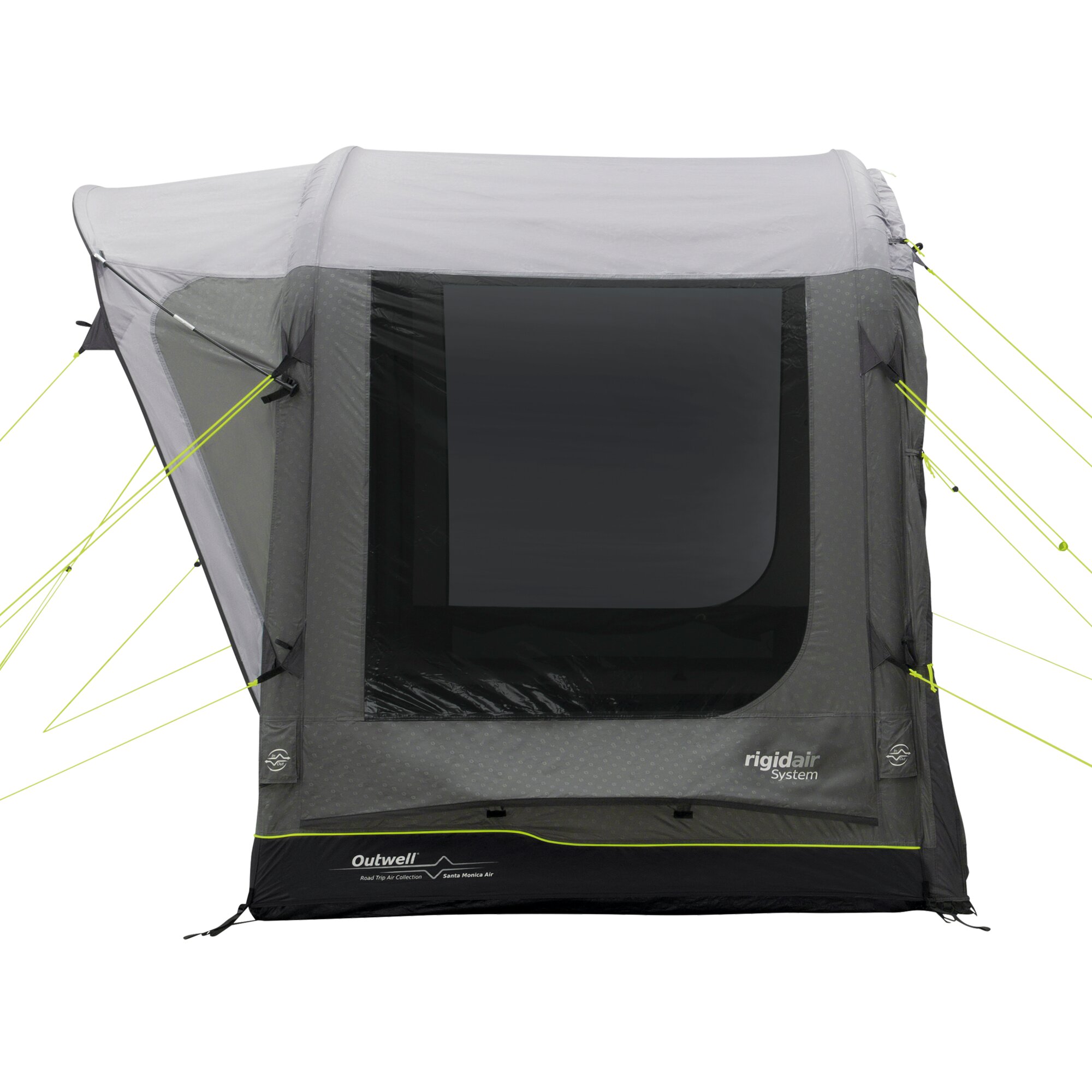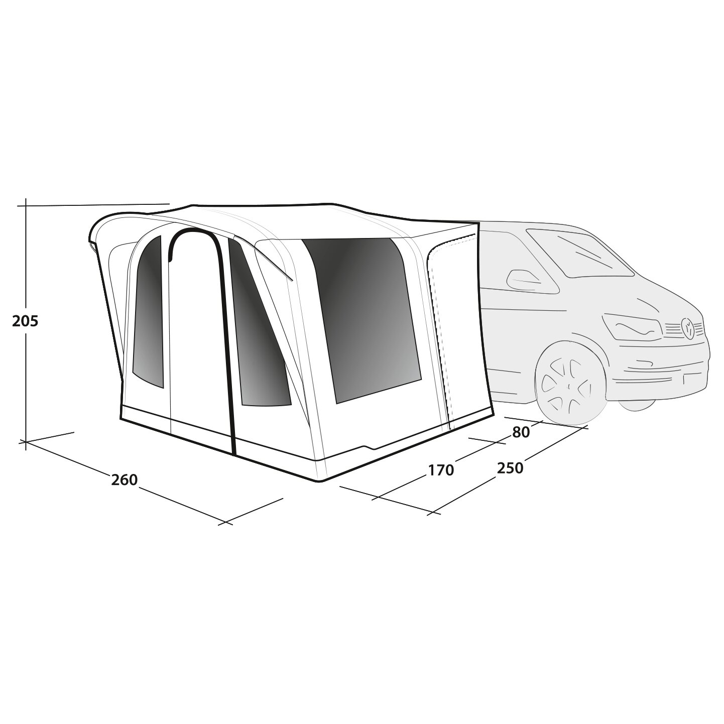 Kompaktowa markiza do vana Santa Monica Air posiada wnętrze z wszytą podłogą (170 x 260 cm). Zabezpieczone wejście przednie wyposażone jest w osobne drzwi z moskitierą. Łącznik posiada dwa boczne wejścia, umożliwiające szybki dostęp do vana nawet przy złej pogodzie. Tę wolnostojącą markizę można bardzo szybko i łatwo rozłożyć za pomocą dołączonej pompki.