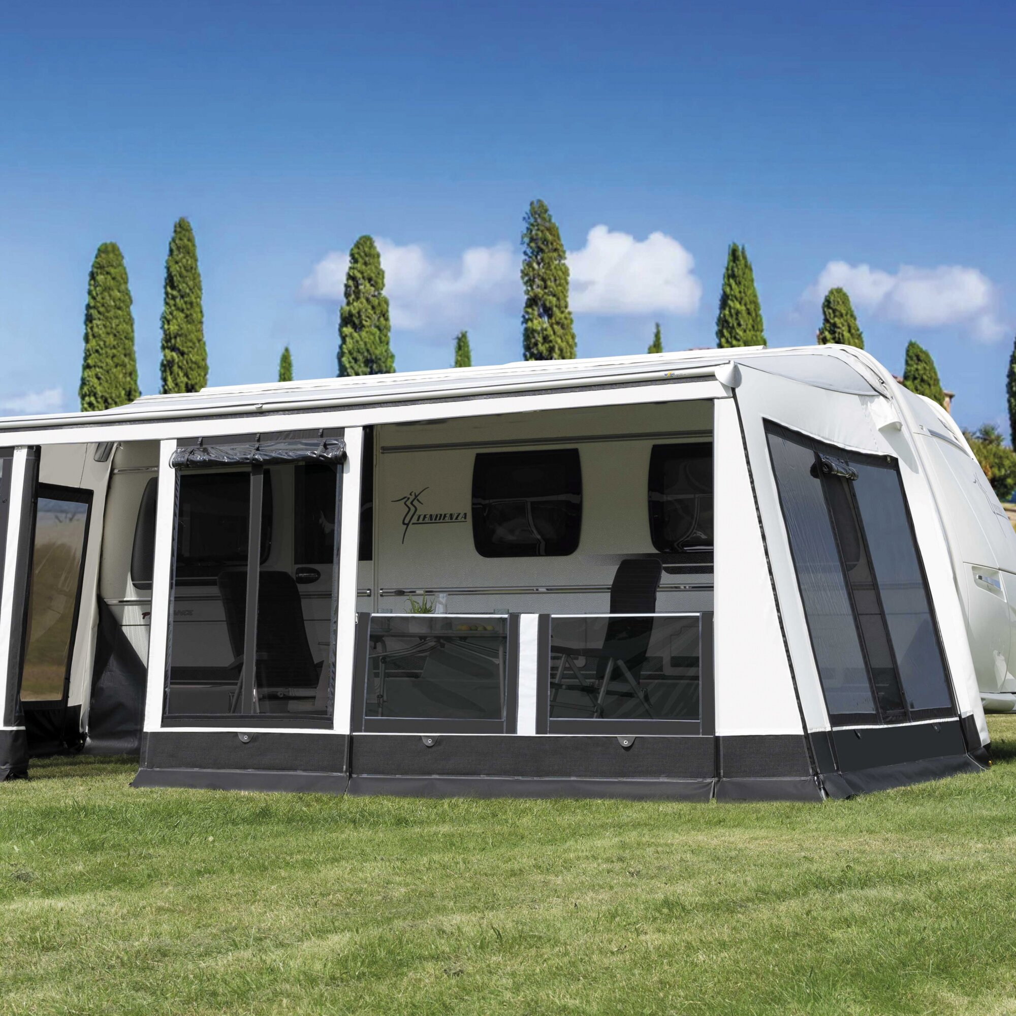Namiot przedsionkowy Modul Basic składa się z 2 paneli bocznych i panelu przedniego, wykonanych z tkaniny Airtex. Innowacyjne elementy wyposażenia, takie jak system blokowania dachu i masztów, przyciemniana folia dużych panoramicznych okien z funkcją Air Vent, zapewniają podróżującym kamperom wysoki poziom komfortu. Panele boczne są wyposażone w okno Air Vent (każdy od rozmiaru 7), a panele przednie w okno Air Vent. Wszystkie panele można całkowicie otworzyć, złożyć na werandę lub odłączyć. Obie połówki dzielonego panelu przedniego można otwierać lub zdejmować osobno. Ponadto drzwiczki zintegrowane z panelem przednim można zamontować z lewej lub prawej strony. Standardowa dostawa obejmuje 15-centymetrowy (zewnętrzny) i 30-centymetrowy (wewnętrzny) fartuch przeciwbłotny oraz kryte zamki błyskawiczne.