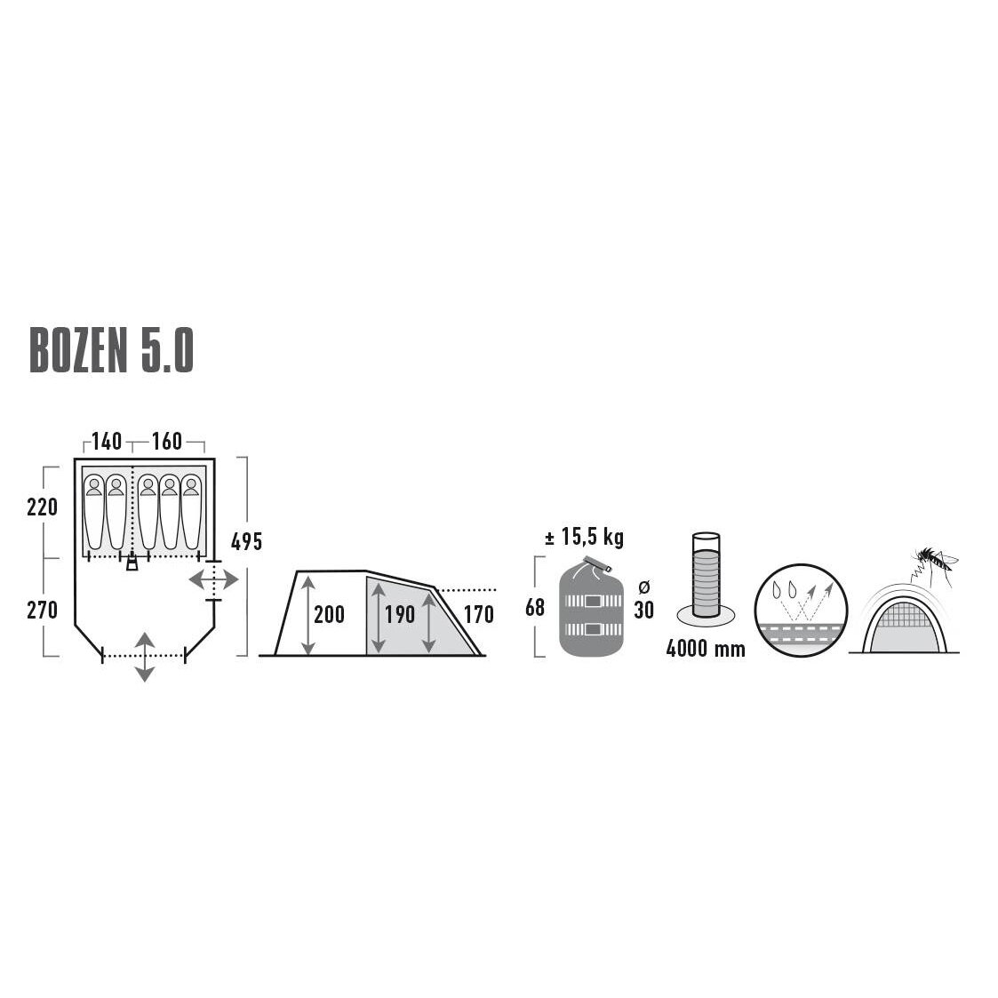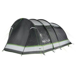 Rodzinny namiot tunelowy z wszytą podłogą, która chroni przed wilgocią, brudem i pełzającymi zwierzętami. Część dzienna o wysokości 2 m zapewnia miejsce na sprzęt kempingowy. Dwa wejścia z gazy i dwa stałe otwory wentylacyjne zapewniają wentylację części dziennej i chronią przed uciążliwymi owadami. Cztery panoramiczne, przezroczyste okna z folii zapewniają mnóstwo światła w części dziennej. Zasłony chronią przed ciekawskimi spojrzeniami. Dach ma aluminiową powłokę i odbija ciepło. 3-stopniowa wentylacja High Peak „Dual Flow” w części sypialnej idealnie dostosowuje się do każdej pogody. 1. Noce tropikalne: otwórz duże okno z moskitierą na 100%. 2. Bezdeszczowa pogoda: otwórz klapę pokrowca zmiennie w zakresie 30–50% w zależności od potrzeb. 3. Zła pogoda: zamknij klapę pokrowca na 100%. Pod klapą pokrowca znajduje się stała wentylacja. Bardzo mocne zamki błyskawiczne z osłoną. Bardzo stabilne, stalowe śledzie o grubości 5 mm nie wyginają się nawet na twardym podłożu. Szwy uszczelnione są taśmą, dzięki czemu są wodoszczelne i nie rozrywają się łatwo. Wejście na kable z zamkiem błyskawicznym i prowadzenie kabli do oświetlenia. Przyciemniany namiot wewnętrzny z systemem Vario Vent Control. 2 wejścia z moskitierą chronią przed uciążliwymi owadami i można je wygodnie obsługiwać zmiennie od wewnątrz, w zależności od pogody. Zapinana na zamek ścianka działowa umożliwia podział namiotu wewnętrznego na dużą kabinę lub 2 sypialnie. 2 uchwyty na lampy kempingowe lub latarki dopełniają całości. komfort.
