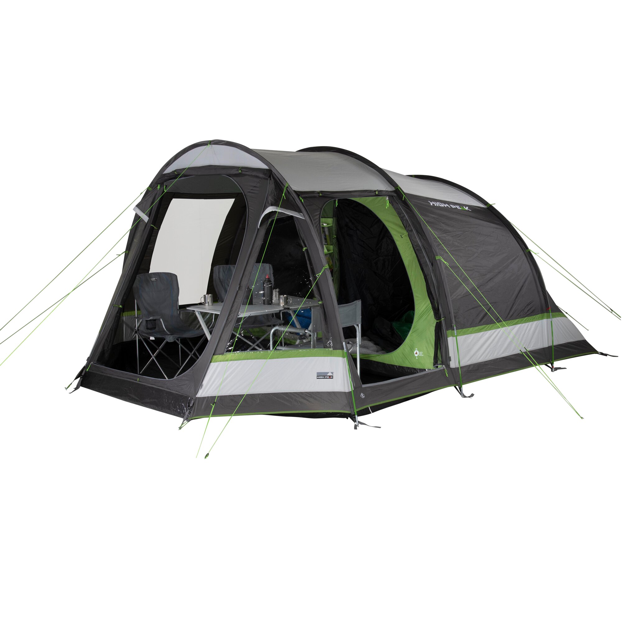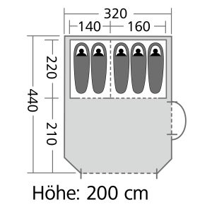 Kompaktowy namiot tunelowy z wszytą podłogą, dwoma wejściami z moskitierą i trzema przezroczystymi oknami z folii z zasłonami. Dach z powłoką aluminiową odbija ciepło. Dwa stałe otwory wentylacyjne zapewniają odpowiednią wentylację. Część sypialna wyposażona jest w 3-stopniowy system wentylacji "Dual Flow". Okno z moskitierą i dodatkową rynną. Wejście na kabel za pomocą zamka błyskawicznego i prowadnicy do oświetlenia. Przyciemniany namiot wewnętrzny z systemem Vario Vent Control. W zestawie wszyte kieszenie i organizery.