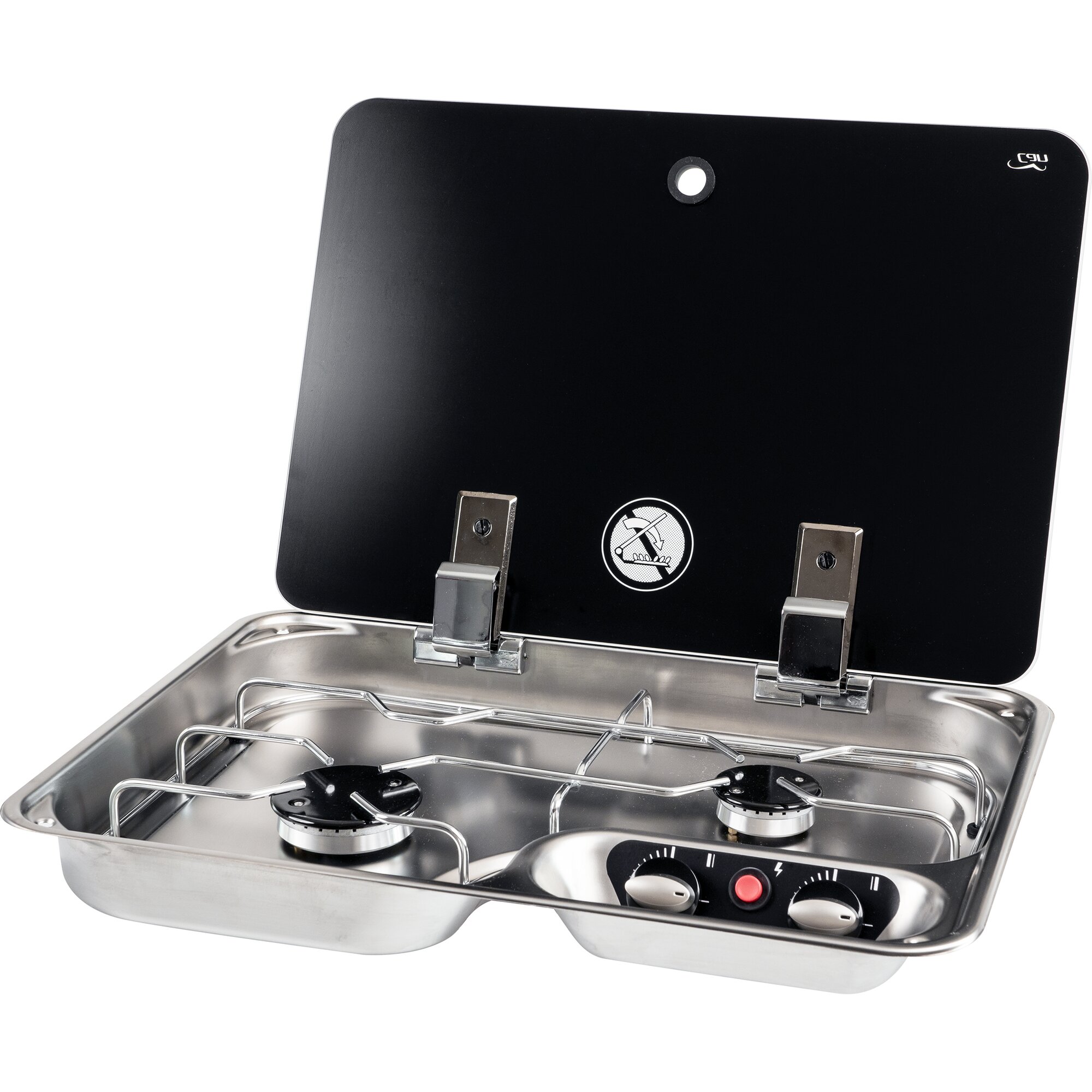 Płyta grzewcza do zabudowy z pokrywą z hartowanego szkła bezpiecznego. Z zapłonem elektrycznym (wymagane napięcie zasilania 12 V) i systemem bezpieczeństwa zapłonu; z uszczelką, ciśnienie przyłączeniowe 30 mbar, moc 1 x 1 kW, zużycie 1 x 73 g/h, 1 x 124 g/h. Głębokość montażu 8 cm, wymiary wycięcia 44 x 32 cm, wymiary zewnętrzne 46 x 33,5 cm, waga 4,6 kg.