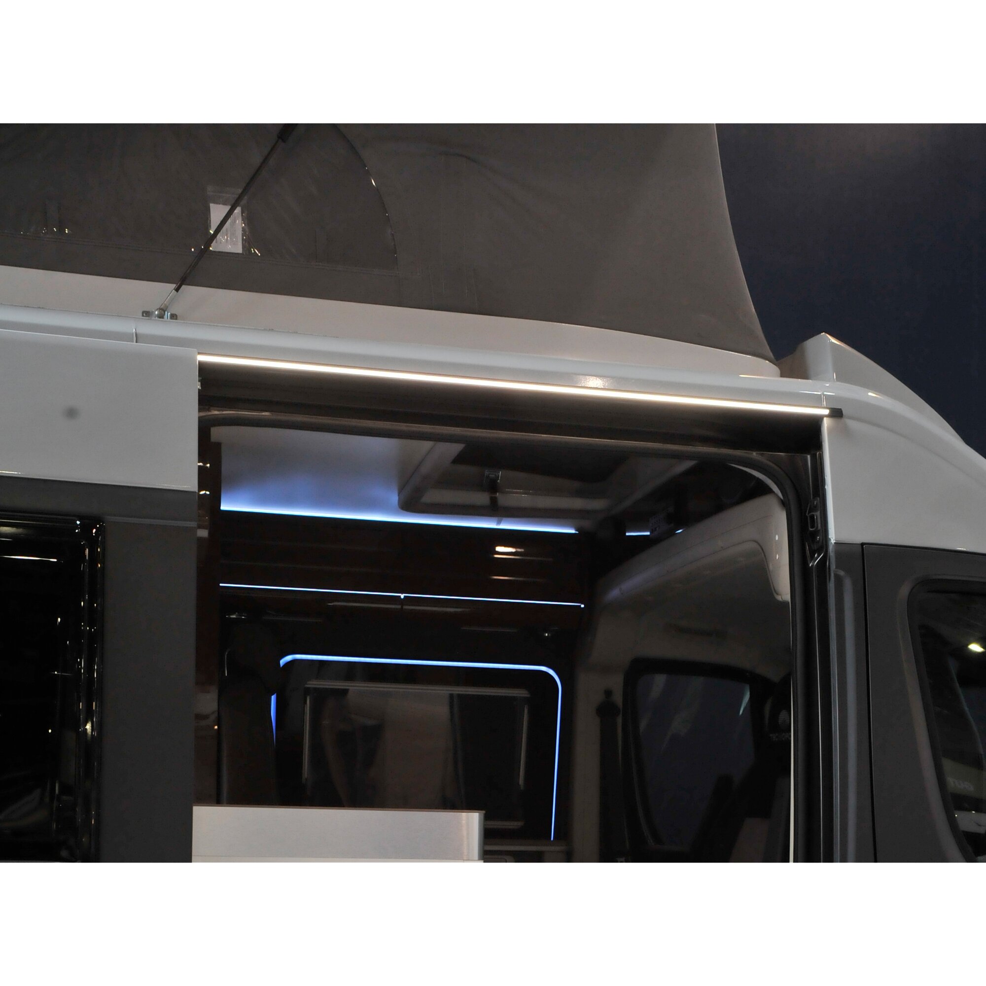 Problem braku oświetlenia zewnętrznego w Twoim vanie możesz elegancko rozwiązać dzięki aluminiowemu profilowi LED firmy Dimatec. Prosty montaż na górnej ramie drzwi przesuwnych. Aluminiowy profil LED z 270 diodami LED zapewnia bardzo przyjemne światło. Czas świecenia: 25 000 godz.