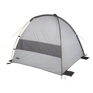 Wolnostojący namiot plażowy jest wyjątkowo łatwy i szybki w montażu. Siatkowe panele zapewniają odpowiednią wentylację i zapobiegają gromadzeniu się ciepła w namiocie. Wyposażony w organizery do przechowywania przyborów. Namiot plażowy jest zabezpieczony czterema workami z piaskiem. Przy silnym wietrze linki odciągowe i plastikowe śledzie zapewniają namiotowi większą stabilność. Materiał zewnętrzny powlekany aluminium.