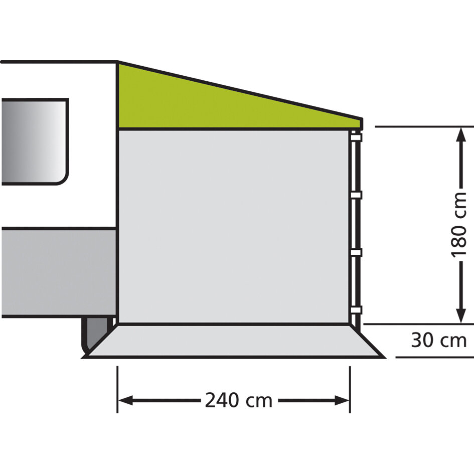 Do daszków przeciwsłonecznych o głębokości 240 cm. Ściana boczna jest zawieszona na ramie daszku i napinana w dół za pomocą regulowanych pasów. Można ją uniwersalnie stosować po prawej lub lewej stronie.