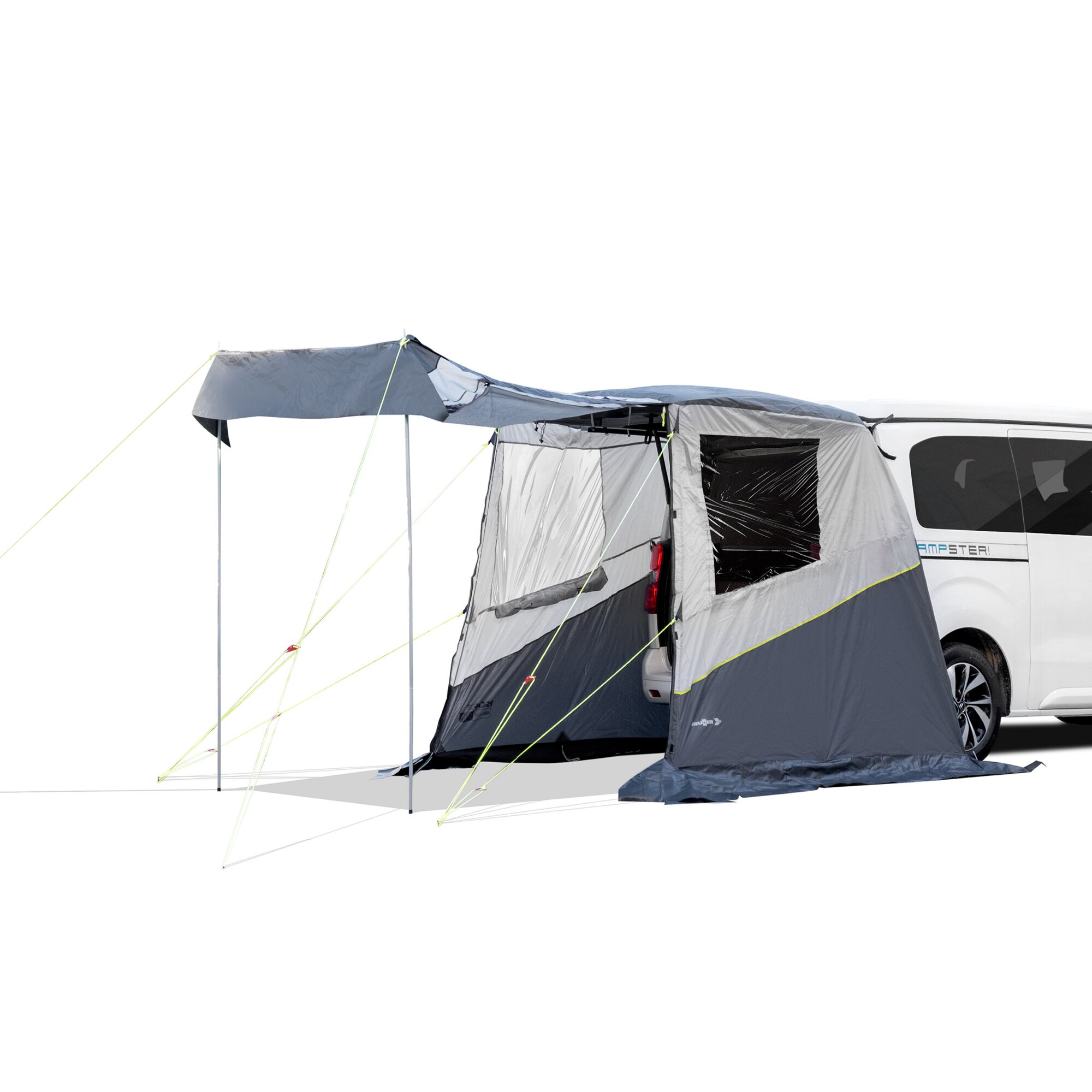 Bezramkowy namiot na tylną klapę pasuje do różnych modeli samochodów: Peugeot Traveller, Citroën Spacetourer i Toyota Proace. Szybki i łatwy montaż bez użycia narzędzi za pomocą pasków magnetycznych i taśm. Bardzo odporny na wiatr dzięki pasom napinającym. Zewnętrzna osłona przeciwbłotna chroni przed deszczem. W zestawie 30-centymetrowe plastikowe śledzie i torba. Uchwyt na rowery można pozostawić na tylnej klapie. Zwijana ściana przednia i boczne z okienkami i roletami zaciemniającymi.