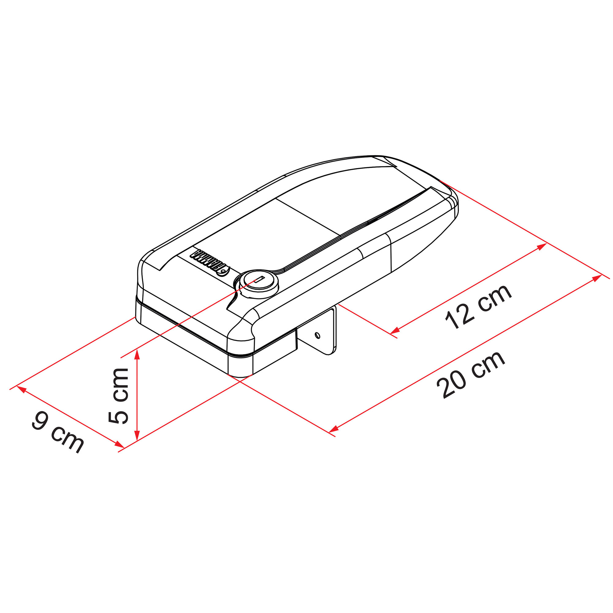 Długość całkowita 20 cm, zakrywająca zamek drzwi kampera. Montowana na aluminiowym profilu drzwi lub profilu garażowym za pomocą trzech wkrętów samogwintujących.
