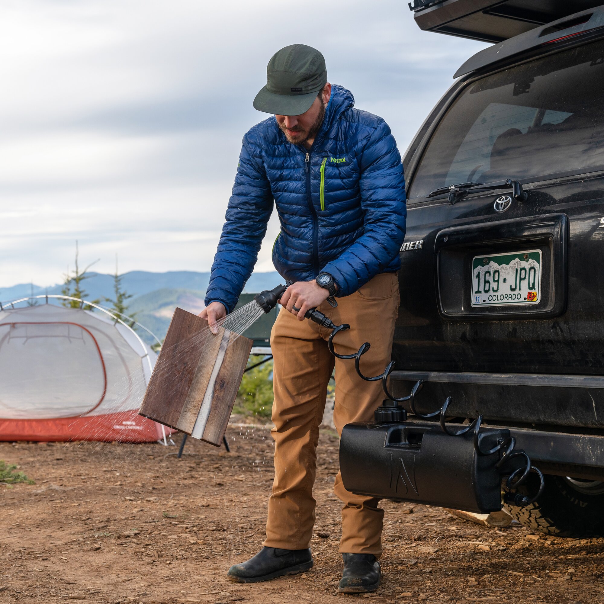 Dzięki WaterPORT 4.0 masz dostęp do ok. 15 litrów wody, gdziekolwiek potrzebujesz umyć, spłukać, odświeżyć lub po prostu podlać. Napełnij go zwykłym wężem ogrodowym lub użyj ręcznej pompki (brak w zestawie), gdy jesteś poza domem. Do zintegrowanego zaworu Schradera możesz nawet podłączyć pompkę rowerową lub sprężarkę powietrza, aby wytworzyć ciśnienie wody (do 2,75 bara).