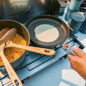Wysokowydajna ceramiczna powłoka zapobiegająca przywieraniu ułatwia gotowanie i czyszczenie. Opatentowany składany uchwyt, który blokuje się na zewnętrznych uchwytach, zapobiegając zarysowaniom i zapewniając pewny chwyt podczas gotowania. Odporna na pęknięcia i wysoką temperaturę pokrywka z sitkiem. W zestawie wytrzymała torba na zestaw.