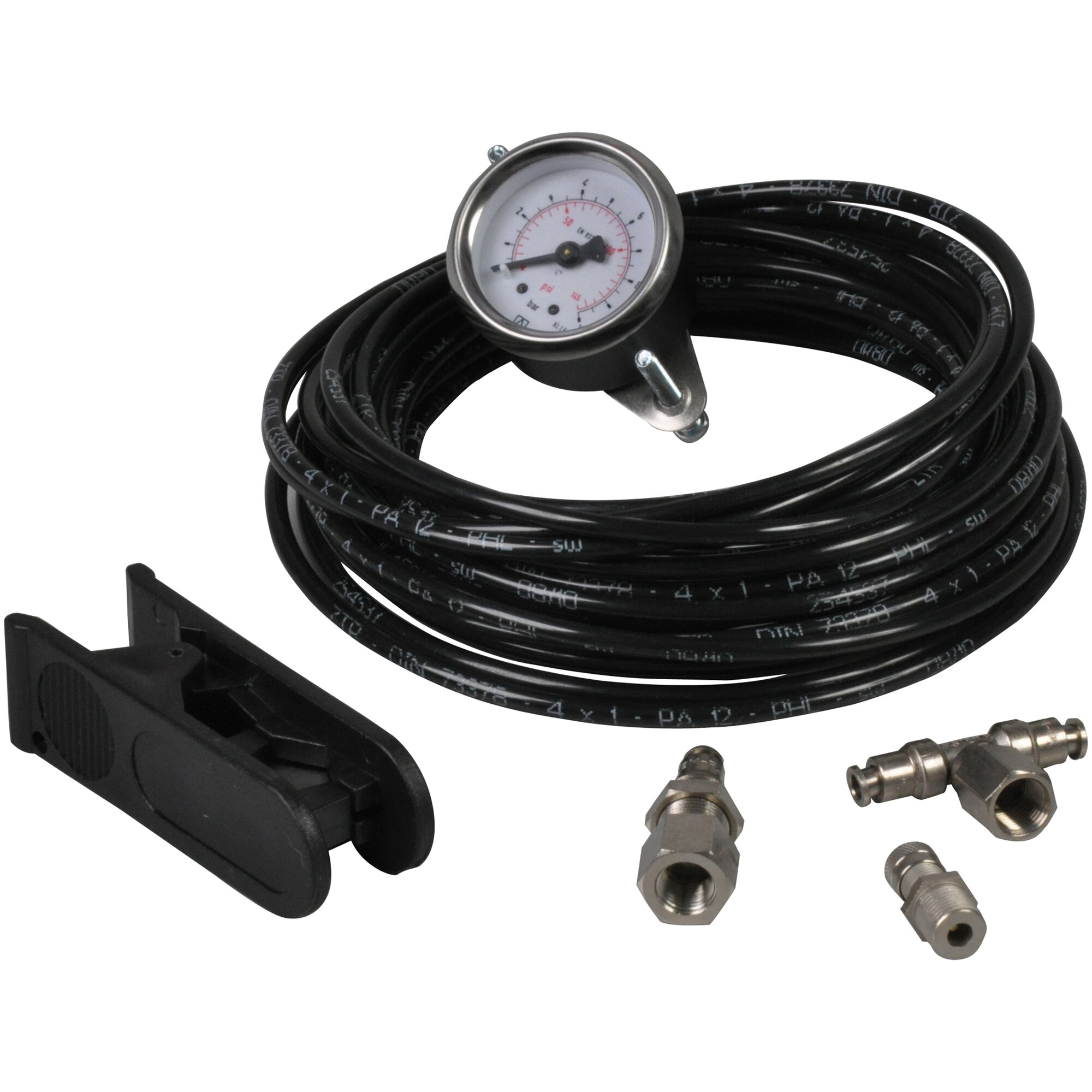 Uniwersalny zestaw do wszystkich podnośników pneumatycznych Linnepe, składa się z 1 manometru, 1 zaworu napełniającego, a także węży (ø 4 mm) i materiałów przyłączeniowych.