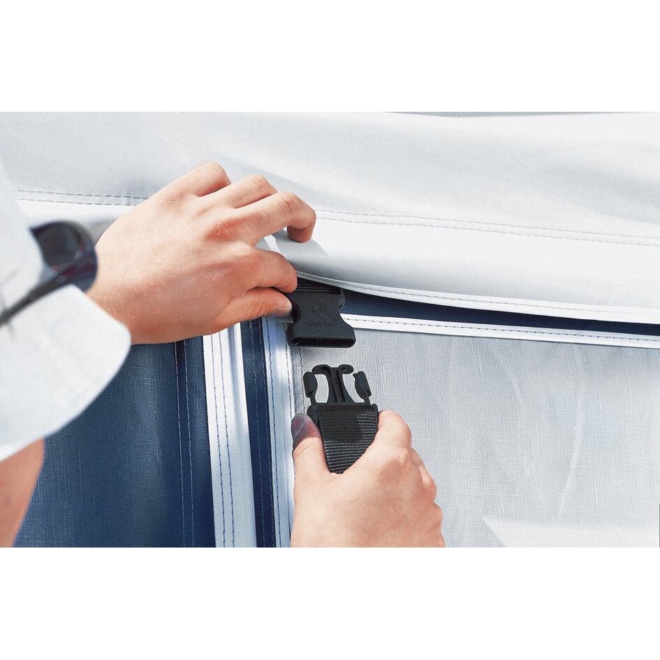 Ten niezwykle wytrzymały pas sztormowy chroni namiot przed silnym wiatrem. Zapina się go po bokach przedniej ściany, nie obciążając bocznych słupków czaszy. Zastosowanie dodatkowej sprężyny znacznie zmniejsza obciążenie rozciągające pasa i namiotu.