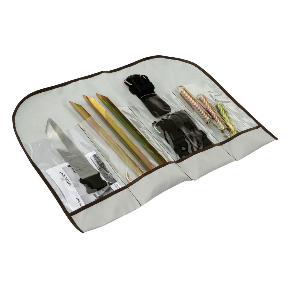 Składa się z:3 pasów o szerokości ok. 40 mm z klipsem; 3 ocynkowanych specjalnych śledzi o długości ok. 38 cm; 3 sprężyn spiralnych o średnicy ok. 18 mm; pętli napinającej z klamrą.