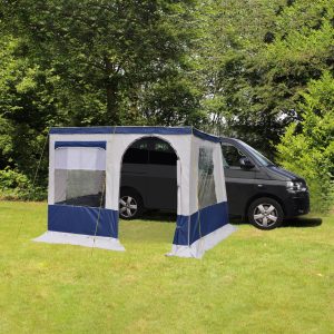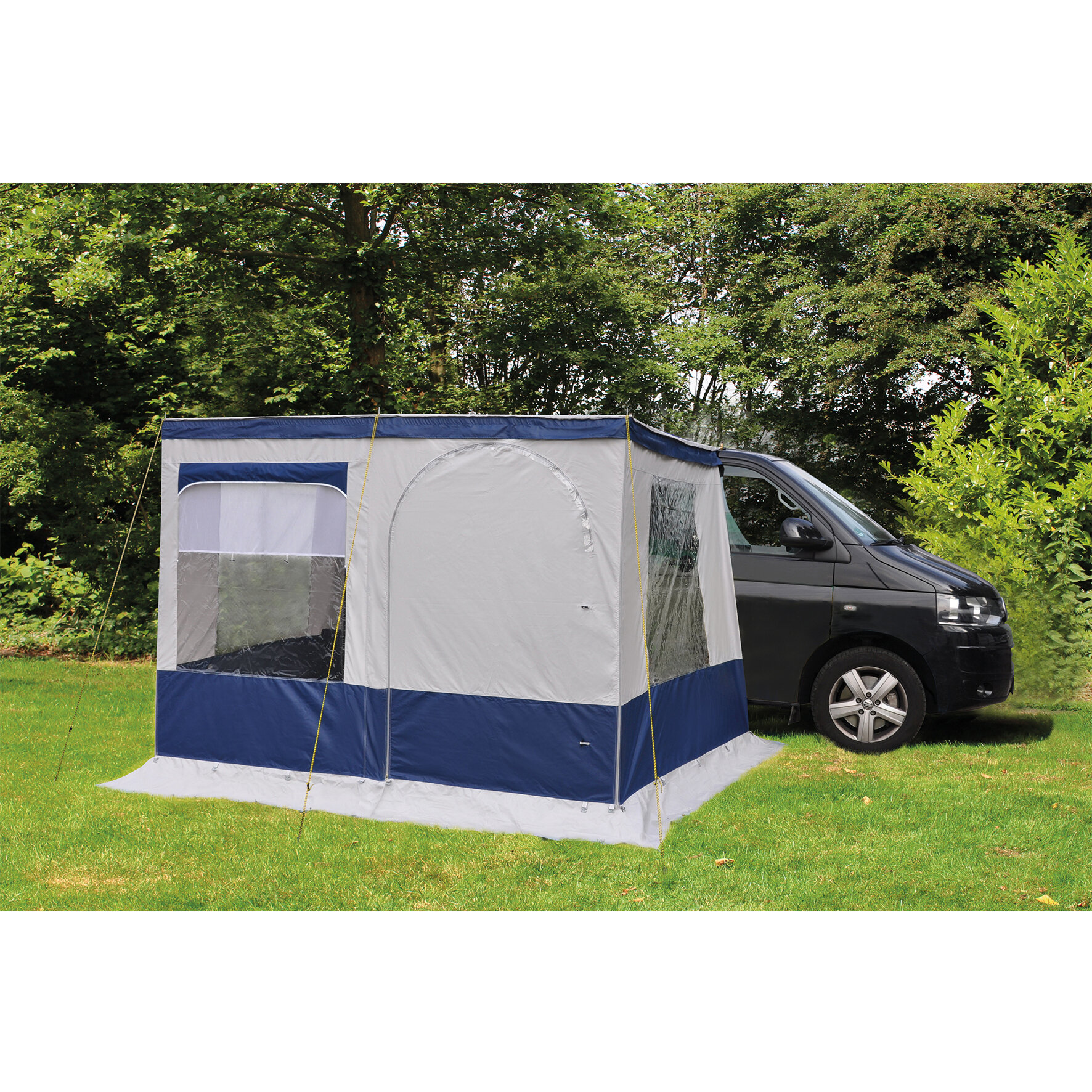 Dzięki temu zestawowi rozszerzeń możesz przekształcić markizę przeciwsłoneczną Fjord w markizę. Wystarczy przymocować przednią i boczne ściany do wewnętrznej strony markizy za pomocą pasków rzepowych. Przednia i boczne ściany są połączone za pomocą zamków błyskawicznych. W ten sposób powstaje całkowicie zamknięta markiza, chroniąca przed deszczem i wiatrem. Obie ściany boczne wyposażone są w przezroczyste okna z folii, a ściana przednia ma dodatkowe drzwi wejściowe. W zestawie drążki. Materiał: All Weather Tex.